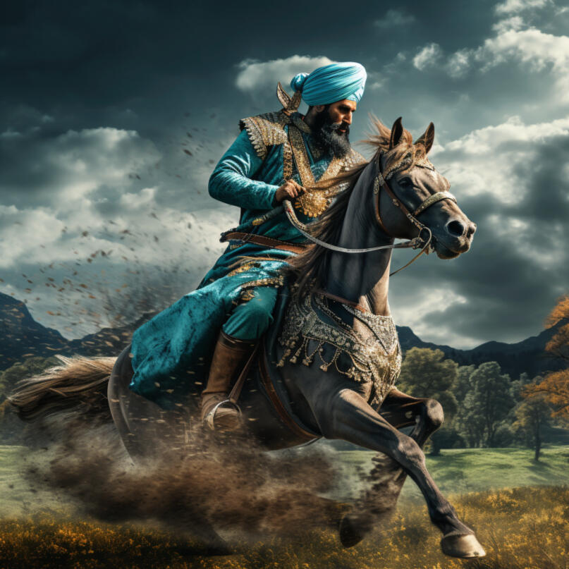 Maharaja Ranjit Singh, often referred to as the Lion of Punjab, was a significant figure in Sikh history and one of the most powerful rulers in India during the early 19th century. He was born on November 13, 1780, in Gujranwala, which is now part of present-day Pakistan.Maharaja Ranjit Singh emerged as the leader of the Sikh Empire and united several regional Sikh kingdoms into a formidable state. He became the Maharaja (king) of the Sikh Empire at the young age of 21 in 1801. Under his reign, the Sikh Empire reached its peak, expanding its borders and maintaining internal stability.Maharaja Ranjit Singh was known for his exceptional military and diplomatic skills. He built a powerful army, known as the Khalsa, which was composed mainly of Sikh warriors but also included Hindus, Muslims, and Europeans. His army was well-trained, well-equipped, and highly organized, making it one of the most formidable forces in the region.One of the most remarkable aspects of Maharaja Ranjit Singh's reign was his policy of religious tolerance. Despite being a devout Sikh himself, he promoted religious harmony and respected the freedom of worship for all faiths. He appointed ministers and officials from different religious backgrounds, ensuring the representation of various communities in his administration.Maharaja Ranjit Singh's empire saw significant cultural and artistic development as well. He patronized the arts, literature, and music, and the Sikh Empire became a center of creativity and learning. Lahore, the capital of the Sikh Empire, witnessed a cultural renaissance during his rule.One of the most iconic symbols associated with Maharaja Ranjit Singh is the golden throne, commonly known as the Koh-i-Noor diamond, which he possessed and was subsequently taken by the British after his death.Maharaja Ranjit Singh passed away on June 27, 1839, at the age of 58, leaving behind an impressive legacy. Despite the challenges faced by his successors, the Sikh Empire continued until its demise following the Anglo-Sikh Wars in the mid-19th century. Maharaja Ranjit Singh remains an important figure for Sikhs and is remembered for his military prowess, astute political skills, and his efforts to unite and uplift Sikhism during a tumultuous period in Indian history.